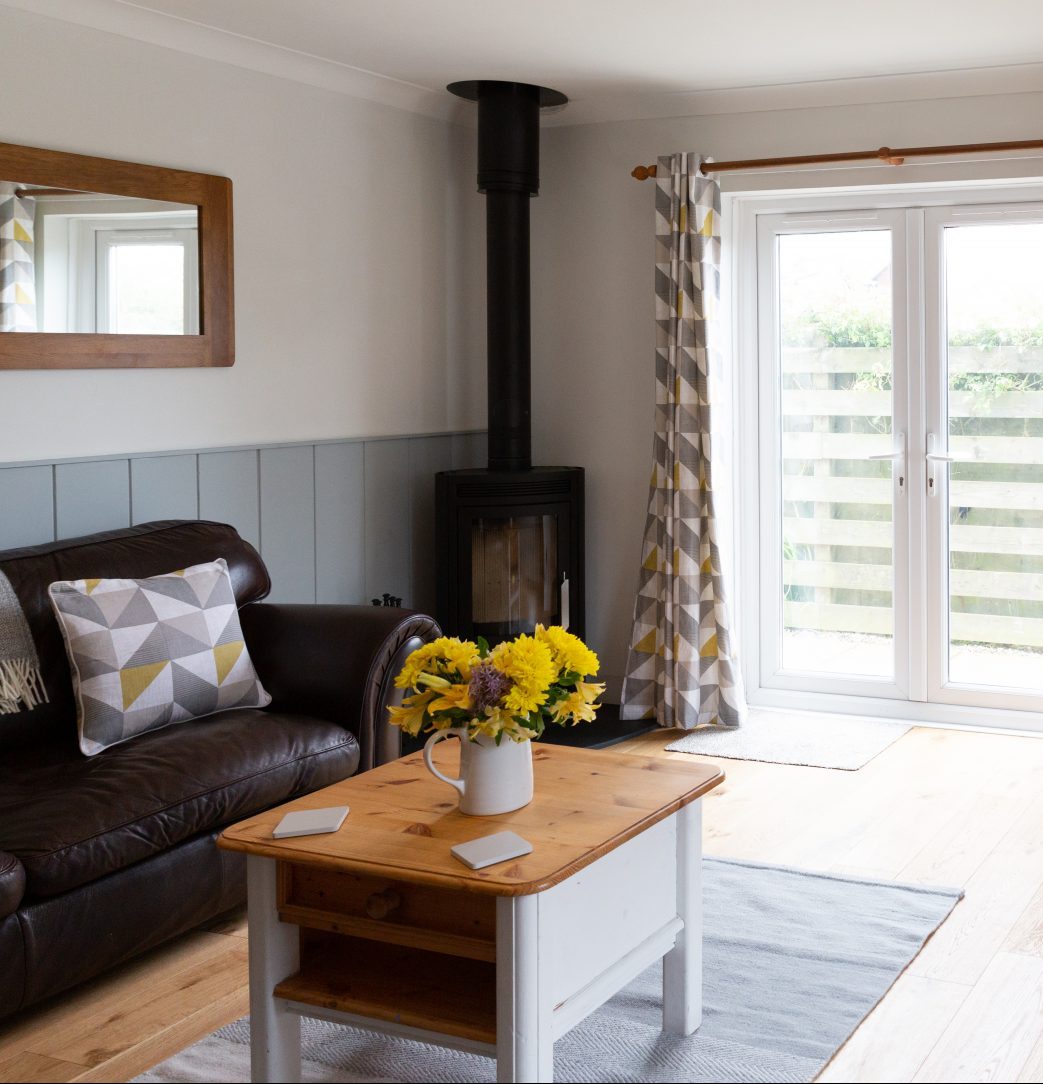 The sunny living room has patio doors opening onto the outside patio area. There are two sofas and a log burning stove for cosy nights in and a Smart TV